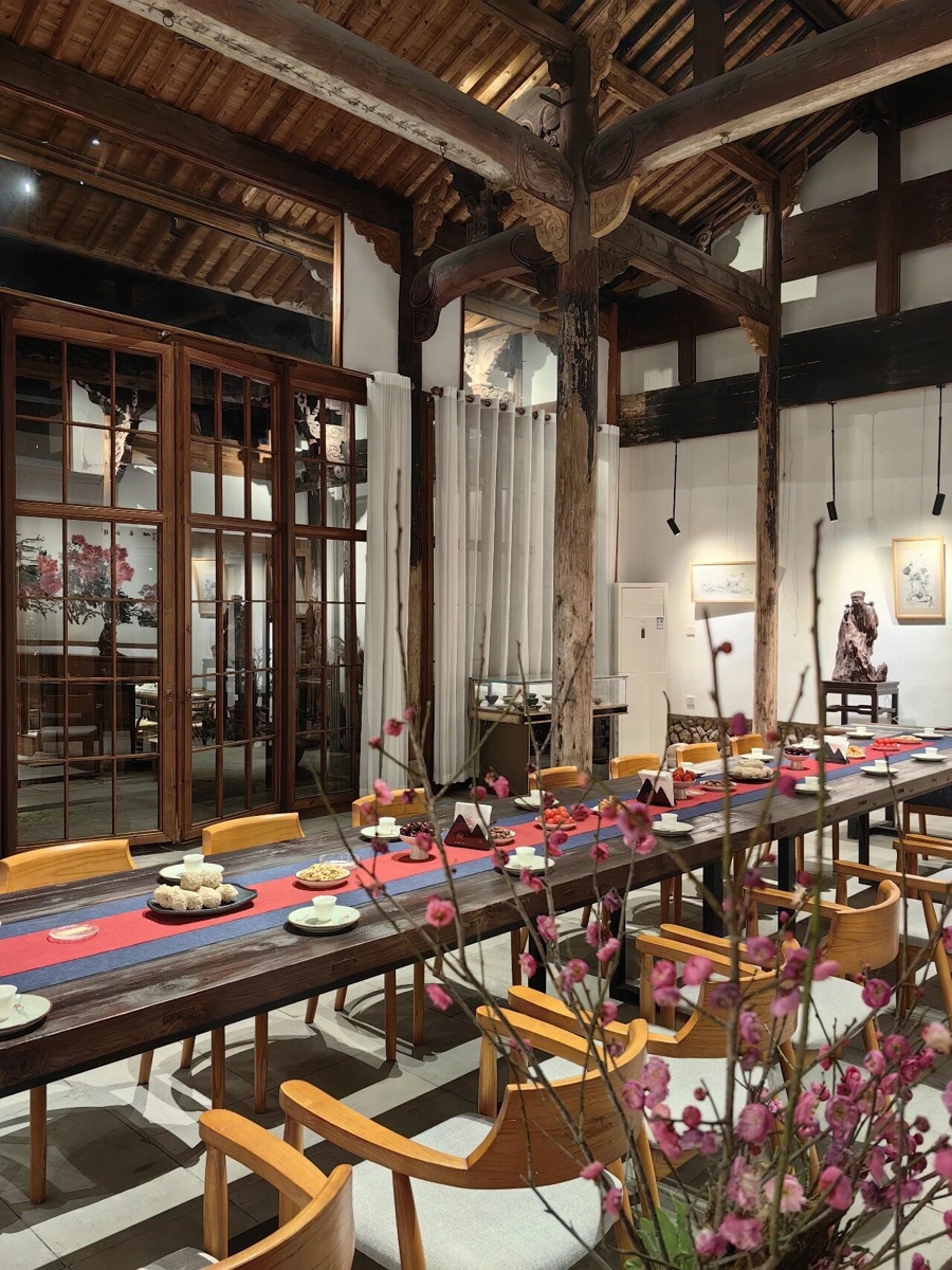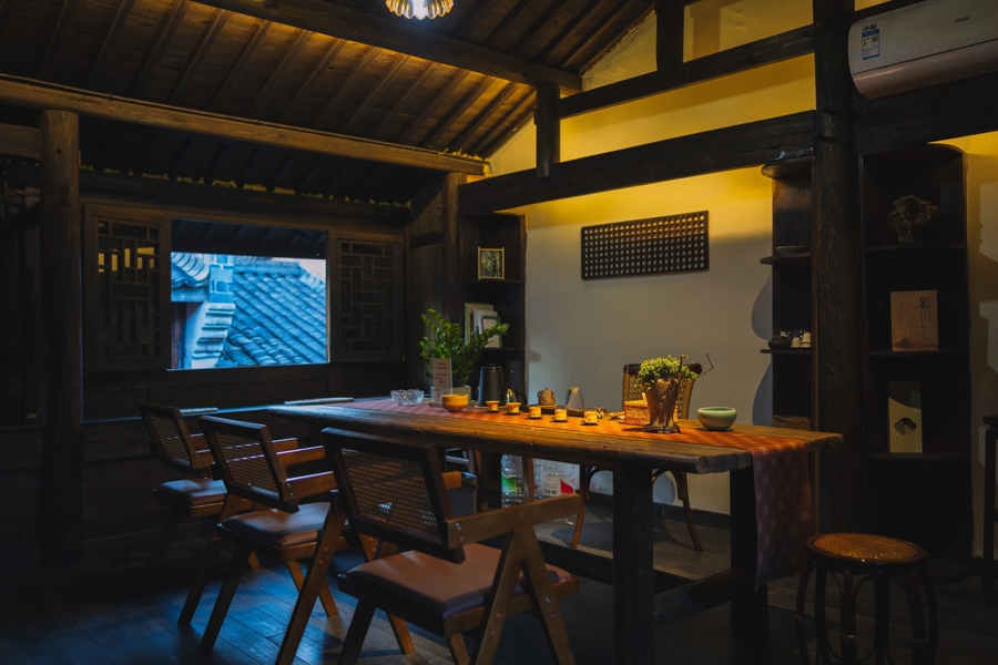 前身是清代王家宗祠的元朴,如今是集茶馆、民宿、艺术空间于一体的复合空间。坐在天井庭院里,看光影从三百年的梁架上缓缓移动,品一杯地道的松阳香茶,仿佛能听见时光在雕梁画栋间低语。这里常有非遗大漆手作与当代艺术展,让喝茶成为一场与古建、与艺术的对话。